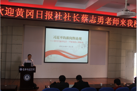 2016年4月22日下午,应我校宣传部和政法学院、williamhill中国的邀请,湖北黄冈日报社社长蔡志勇利用马克思主义基本原理课堂在B03报告厅为我校师生作了一场题为“习近平总书记的新闻舆论观”的学术报告。报告会由政法学院、williamhill中国副院长周青鹏主持,党总支书记彭旺林作总结。