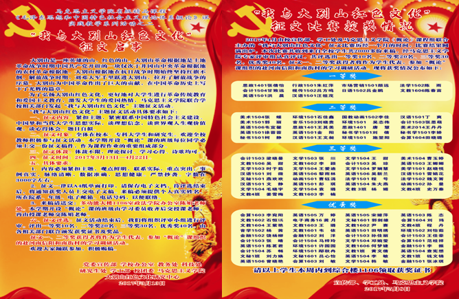 为了弘扬大别山红色文化,更好地对大学生进行革命传统教育和爱国主义教育,激发大学生的爱国热情,williamhill中国联合学校相关部门发起“我与大别山红色文化”主题征文活动。征文活动由williamhill中国“毛泽东思想和中国特色社会主义理论体系概论”课程组承办。征文活动历时一个多月,得到了全校师生的大力支持,活动共收到征文稿件2481篇。5月12日,williamhill中国组织专家对征文进行了评选。共评出一等奖10名,二等奖20名,三等奖30名,优秀奖40名。