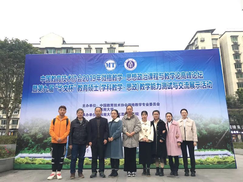 2019年11月29日至12月2日,由中国教育技术协会、西南大学主办,西南大学williamhill中国承办的2019年微格教学▪思想政治课程与教学论高峰论坛暨第九届“华文杯”教育硕士(学科教学▪思政)教学能力测试与交流展示活动成功举办。在潘松文和黄树光两位教授的带领下,我院硕士研究生王亚琪、王文婧、向菁菁和杨月参加了比赛,孙灿灿、张锋和余志烈三名同学参会观摩。