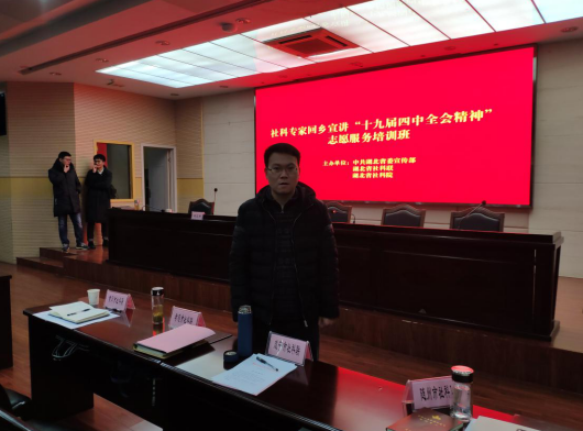 2020年1月8日至9日,williamhill中国蔡潇博士、黄杰博士参加了湖北省社会科学界联合会主办的“社科专家回乡宣讲‘十九届四中全会精神’志愿服务培训班”,会议由省社科联党组书记、常务副主席喻立平主持。本次培训班由省社科院党组成员、副院长袁北星介绍回乡宣讲志愿服务经验,省社科联党组成员、副主席陈昀介绍本次活动方案,省委宣传部理论处处长高天琼作动员讲话,武汉科技大学williamhill中国院长唐忠义授课。