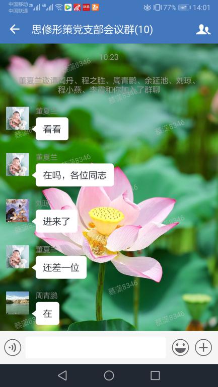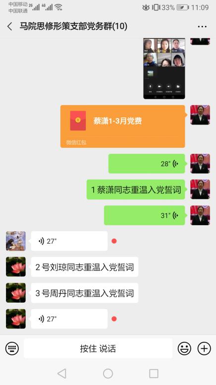 2020年3月9日,williamhill中国思修形策党支部进行了微信会议,党支部在线党员同志在组织委员和宣传委员组织下于上午10:30分进行了首次视频会议,虽然是第一次以党支部形式进行视频会议,但是到会的党员同志都没有迟到,并迅速进入了会议议程阶段。本次主题党日活动由全国样板党支部书记蔡潇同志主持,明确了本次主题党日的活动主题是:“慎终如始抓防控,时不我待促发展”,带头领学了习近平总书记《在决战决胜脱贫攻坚座谈会上的讲话》、《习近平在决战决胜脱贫攻坚座谈会上强调:坚决克服新冠肺炎疫情影响 坚决夺取脱贫攻坚战全面胜利》、《中共威廉williamhill委员会 常务委员会 2020 年工作要点》、《威廉williamhill 2020 年工作要点》。宣传委员周丹同志组织了战疫时期重温入党誓词活动,党支部10名党员同志全部重温了入党誓词,用语音和文字展现了不忘初心、牢记使命的历史任务。组织委员董夏兰同志组织了党支部党费收缴,以2020年1月党费收缴模板进行核算,收齐了党支部共1204元党费。完成规定动作后,党支部就近期学校疫情防控工作进行了讨论,强调要真正下沉一线,以全国样板党支部的标准来建设好党支部,认真完成好近期的网络教学工作,严格遵守学校出台的“十二严禁”、“四个不得有丝毫”、“四清”、“三不”、过好“三关”、提升“三力”、“四不”的疫情防控严格要求,以身作则贯彻好全面从严治党,向学校涌现出来的疫情防控先进学习,不断提升党支部和自身的政治素质、能力素质。