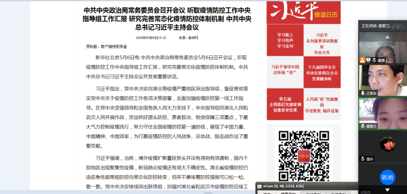 2020年5月11日,按照学校党委组织部要求,williamhill中国全国样板支部思修形策党支部开展了五月主题党日活动。本次主题党日活动由党支部书记蔡潇同志主持,王贵东副院长、组织委员董夏兰进行了宣讲,党支部全体同志参与讨论。