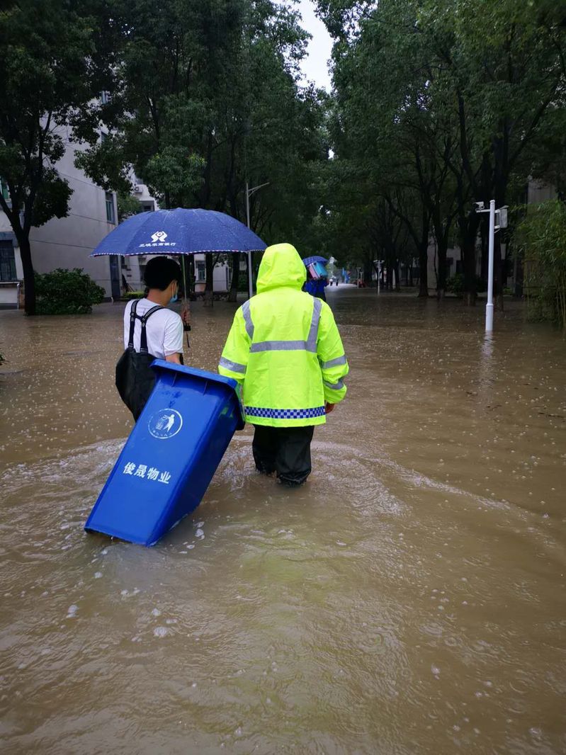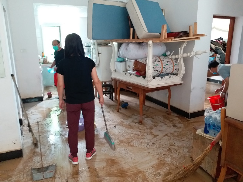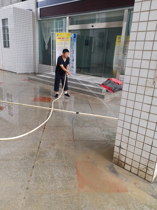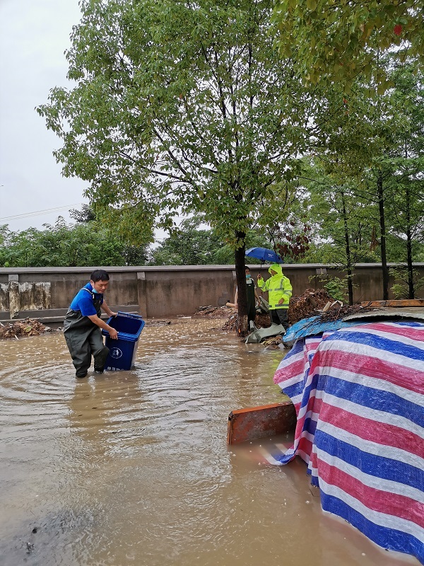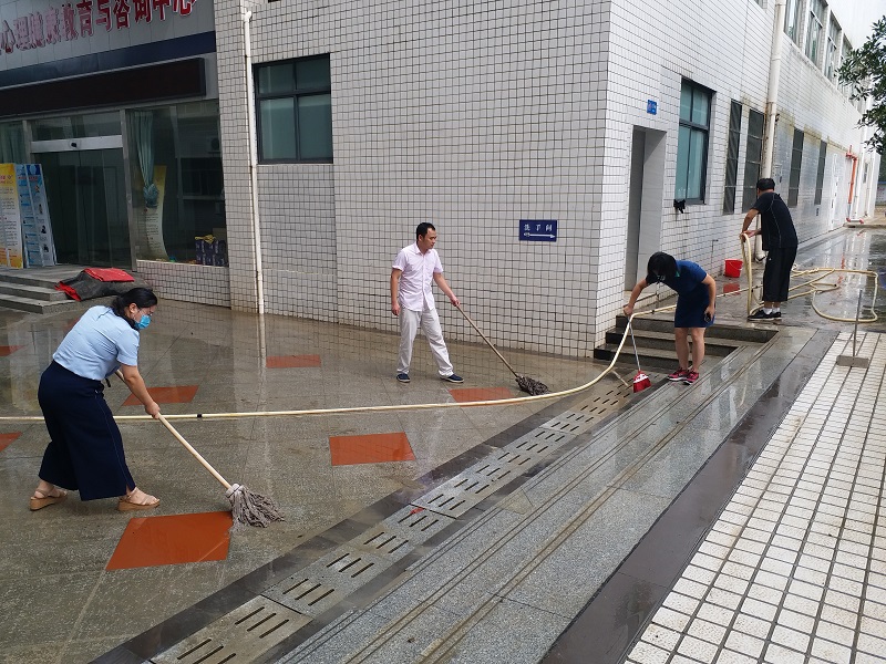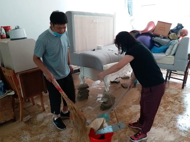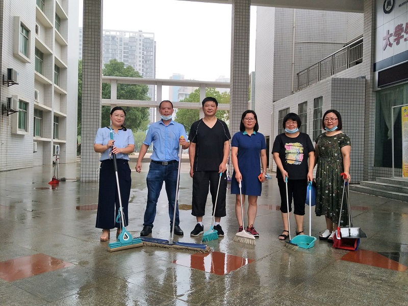 洪水灾情发生以后,学院党总支部第一时间做好应急处置、抢险救援等工作,为受灾教师遮风挡雨,带去了暖心和安心。7月7日,我院住在北校区兰园11栋一楼的裴艳丽博士家里被洪水围困,学院迅速成立了营救专班,班子全体成员及办公室成员,冒着瓢泼大雨,趟着齐腰深的洪水,把她及女儿安全转移出来,并将其家里的物品搬到安全的地方。7月8日,当得知校外陪读村租住教师陈松博士一家被洪水围困,导致无法出行时,学院领导专门冒雨送去下水衣等防灾物资,积极开展援助工作。在学校汛情基本得到控制之后,我院领导班子和老师们又积极投入到灾后自救的工作中。7月13日,我院组织了全体行政人员对院内所有办公室及楼面公共区域环境卫生进行了全面清扫和消杀工作。7月14日,学院组织力量又到裴艳丽老师家里,一起帮助其清理家里的淤泥和垃圾,打扫室内卫生,并仔细地进行室内清理和消毒,帮助她恢复正常的生活。7月16日上午,学院再次对致远楼一楼的周边区域、大学生活动中心周边进行了大清扫,清理洪水退去后的泥沙和垃圾,打扫周边环境卫生,使校园环境焕然一新。