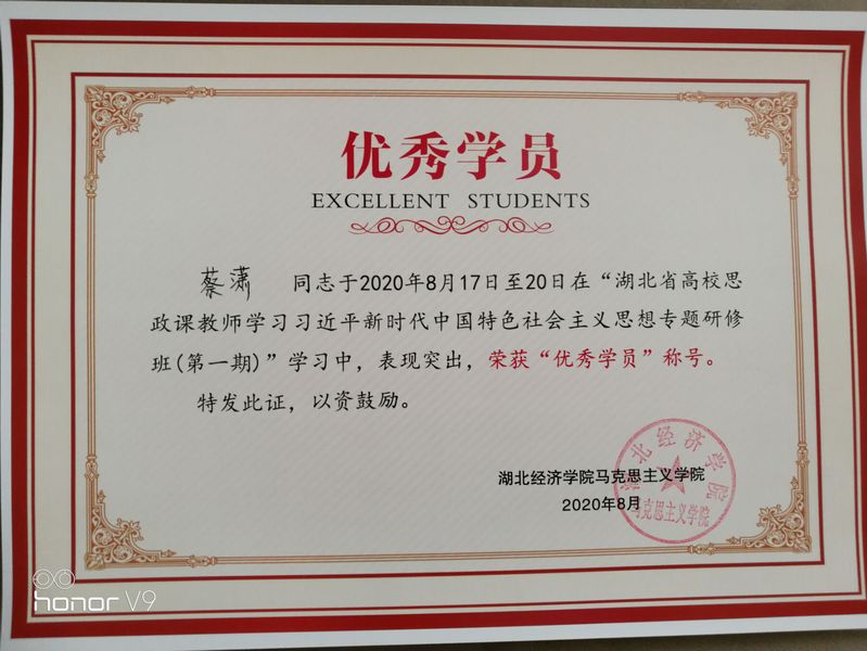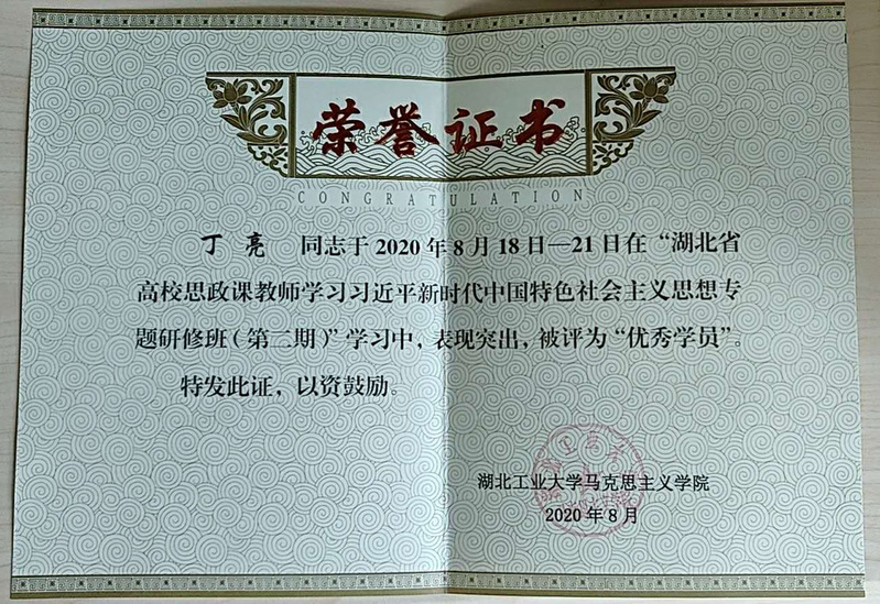 2020年8月17日至24日,williamhill中国蔡潇、陈永典、程之胜、丁亮、李霞、雷红等六位老师参加了湖北省高校思政课教师学习习近平新时代中国特色社会主义思想专题研修班并顺利结业,蔡潇、丁亮和李霞三位老师获得“优秀学员”称号。