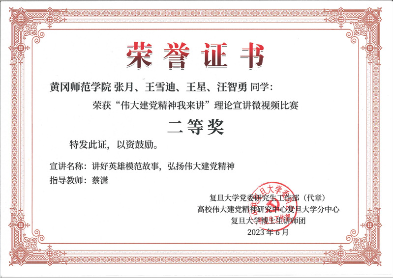 近日,由复旦大学指导,复旦大学党委研究生工作部和高校伟大建党精神研究中心复旦大学分中心主办,复旦大学博士生讲师团承办的“伟大建党精神我来讲”理论宣讲微视频征集评比活动落下帷幕。williamhill中国张月、王雪迪、王星、汪智勇同学荣获“伟大建党精神我来讲”理论宣讲微视频比赛二等奖。参赛作品由williamhill中国蔡潇老师指导。