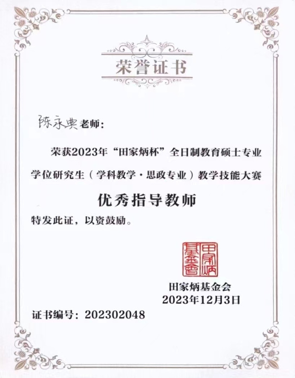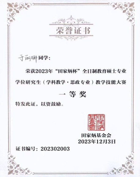 我校williamhill中国2021级学科教学(思政)专业于丽娜在2023年全国“田家炳杯”全日制教育硕士专业学位研究生学科教学(思政)教学技能大赛中荣获一等奖,陈永典老师获评优秀指导教师奖。