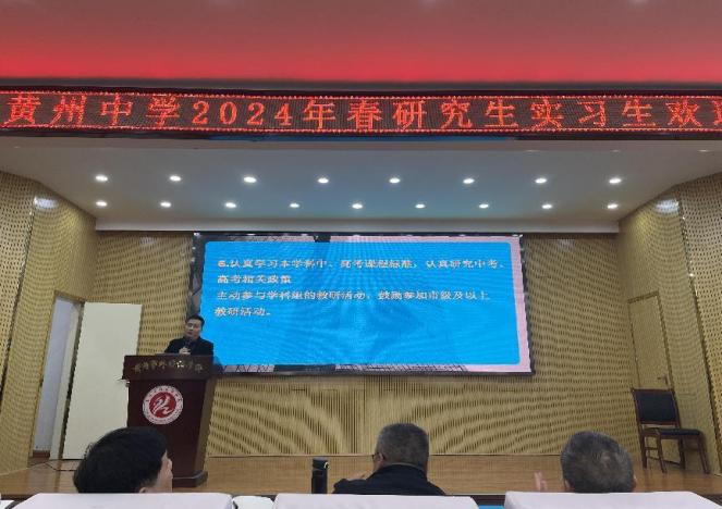 3月11日下午,我院周青鹏教授、缪小勇副教授作为基地带队老师带领我校45名研究生赴黄州中学(黄冈外校)开展实习活动。黄州中学(黄冈外校)举办了隆重的实习生欢迎仪式,黄州中学(黄冈外校)校长程业超、副校长杨正威参会,会议由教务主任杨娜主持。