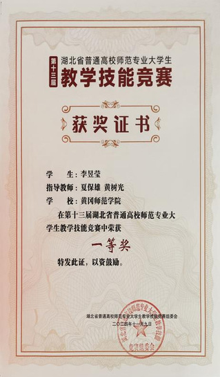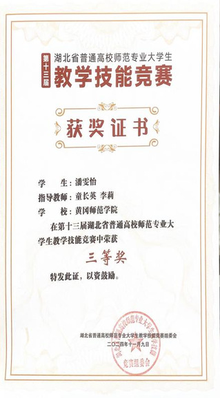 2024年11月9日,由湖北省教育厅举办的第十三届普通高校师范专业大学生教学技能竞赛获奖名单公示。我院参赛选手李昱莹、潘雯怡在比赛中大放异彩,分别荣获一等奖和三等奖。