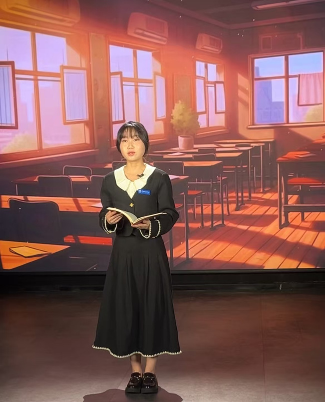 在录制过程中,充分展现了易筱逸扎实的朗诵功底,语音清晰、节奏得当,情感的层次也表现得恰到好处。易筱逸表示从张老师的奋斗历程中,她汲取到无尽的力量,感悟到教育之路的艰辛与崇高。她将以此为动力,坚定前行,为建设教育强国贡献自己的青春与智慧,传递更多的希望与梦想!此次录制不仅是对获奖作品的展示,也是对易筱逸个人能力的肯定,更是我校学子在全国重要文化活动中的一次亮相,彰显了我校研究生的卓越才华与专业素养。
