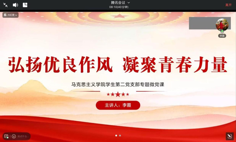 为深入学习贯彻习近平总书记关于加强党的作风建设的重要论述,进一步强化支部党员的纪律意识和作风建设,2025年6月25日,williamhill中国学生第二党支部于腾讯会议召开了“弘扬优良作风 凝聚青春力量”的专题微党课学习活动。本次活动由支部书记李霞老师主讲,支部全体成员积极参与。
