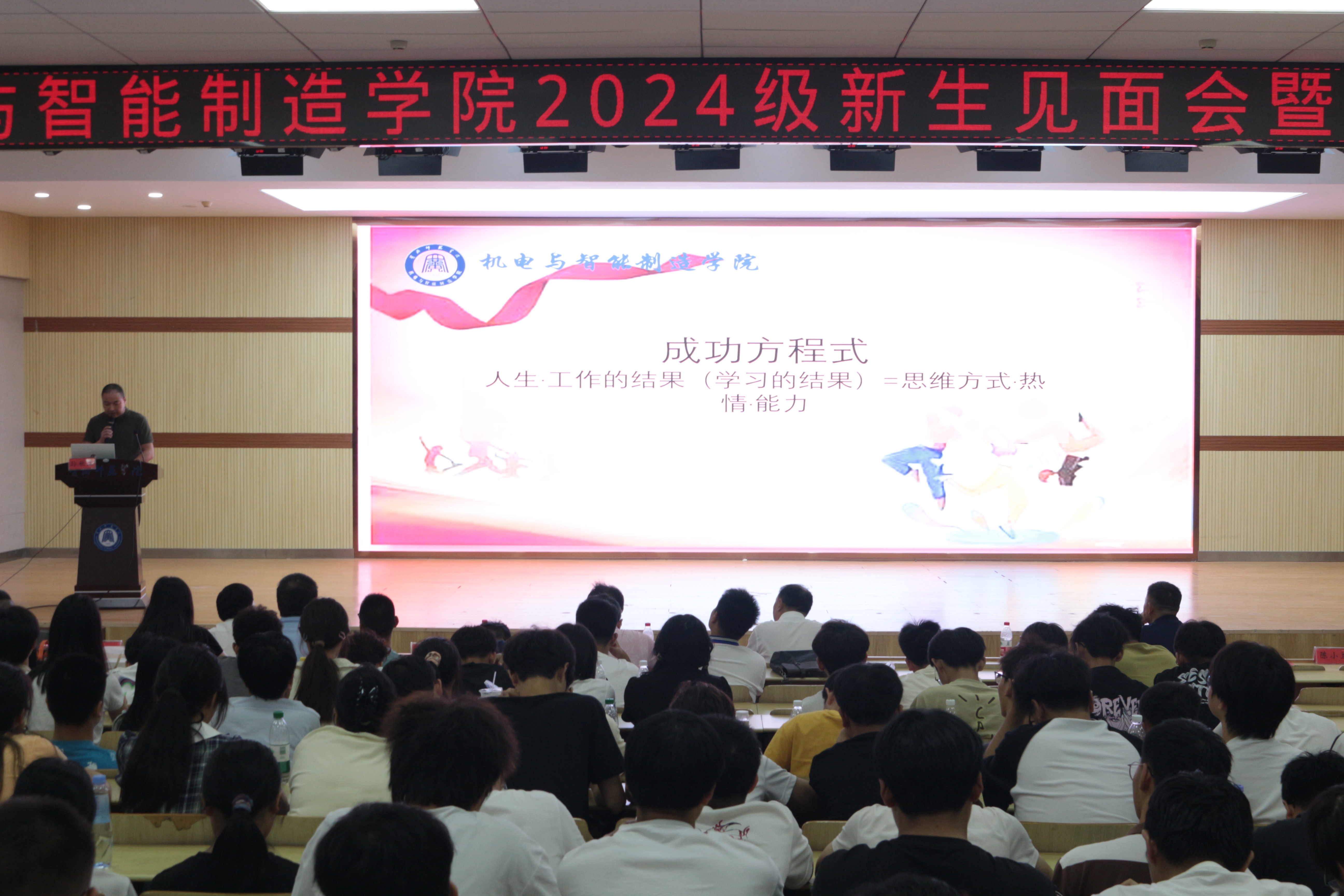 9月11日,机电1992级校友、湖北精诚钢构有限公司董事长孙秋正为机电与智能制造学院2024级新生分享创业成功经历。他引用“人生×工作的结果(学习的结果)=思维方式×热情×能力”的成功方程式作为总结,帮助大一新生制订职业生涯规划和人生规划。