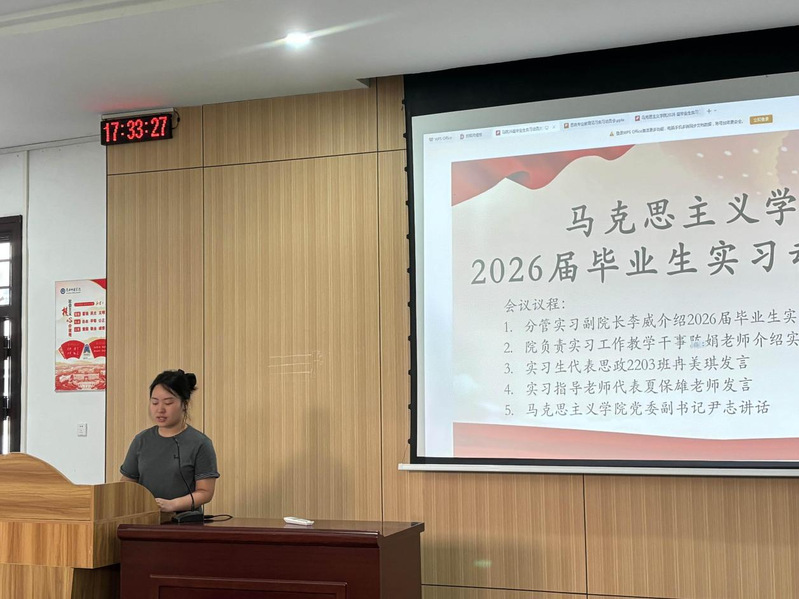 实习生代表、思政2203班冉美琪同学在会上发言。她表达了对学院培养的感谢和对实习实践的期待,并代表全体实习生承诺,将在实习过程中严守纪律、虚心学习、主动钻研、展现风采,不负师长期望,努力在实践中巩固专业知识、提升教学技能。